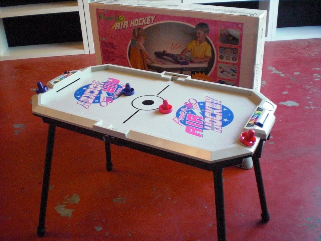 AC Power air hockey tafel met elektronische sensor en electronisch geluid. High ventilator speed. Exclusief batterijen (6 x 1,5 V, AA), inclusief adapter.