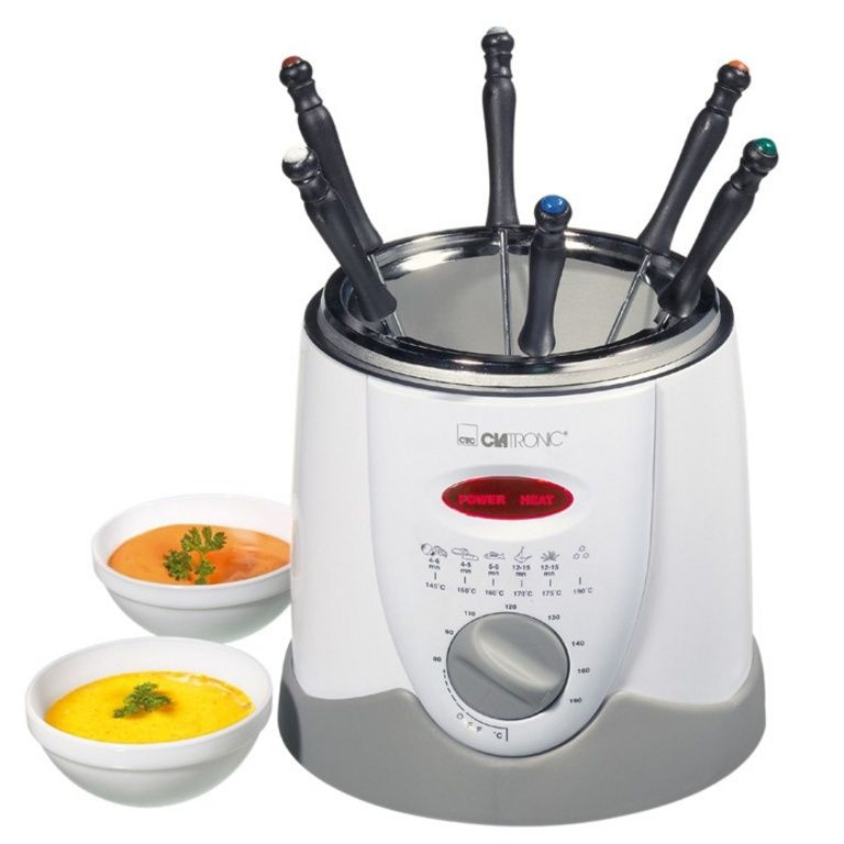 mand met afneembare handgreep, 6 fonduevorkjes (gekleurd) en beschermingsring. Verwisselbaar reuk- en vetfilter. Traploos regelbare thermostaat en oververhittingsbeveiliging. Inhoud: 1 l. Vermogen: 900 W.