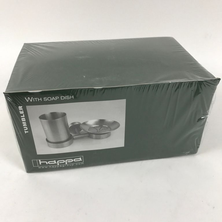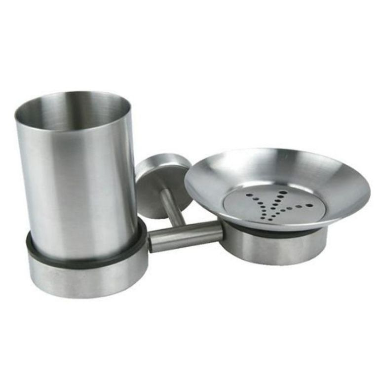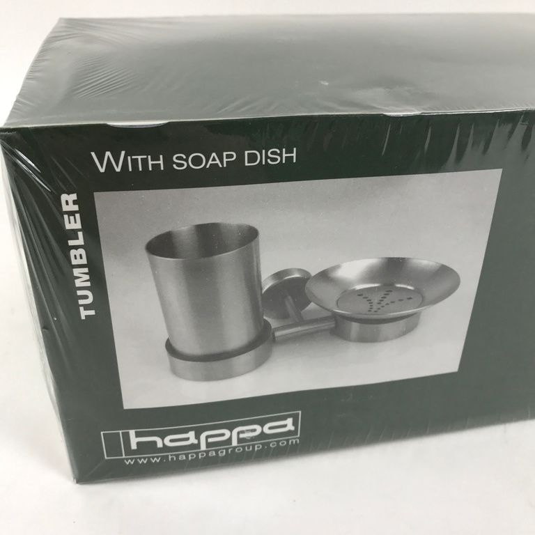 Badkamer Beker & Zeephouder. Deze Happa Badkamer set bestaat uit een rvs plateau met wandbevestiging. Op deze wandbevestiging is een beker geplaatst voor tandenborstels, tandpasta en andere attributen. Ook is er een schaaltje bevestigd voor het op de plaats houden van losse zeep. Het geheel is gemaakt van hoogwaardig RVS.