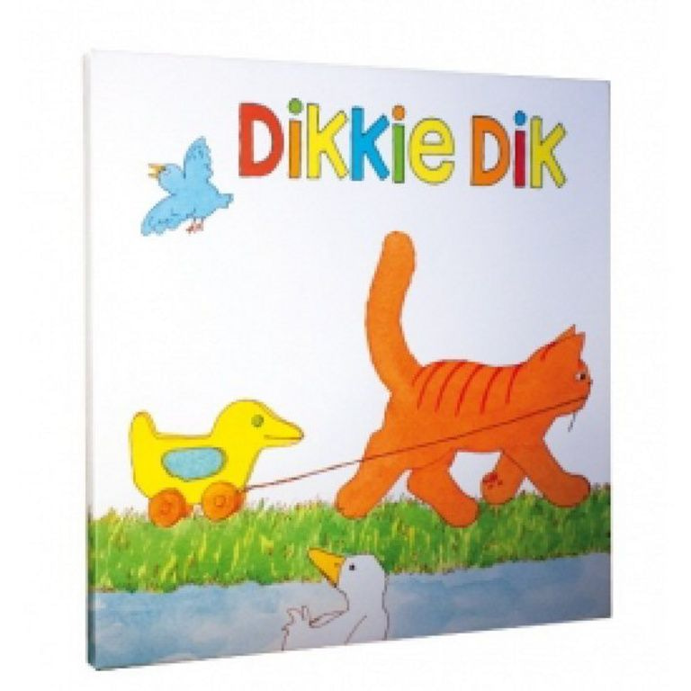 Lief schilderijtje voor de kinderkamer. Dikkie Dik is druk bezig om een eentje vooruit te trekken. Fleur de kinderkamer op met dit kleurrijke Canvas doekje.