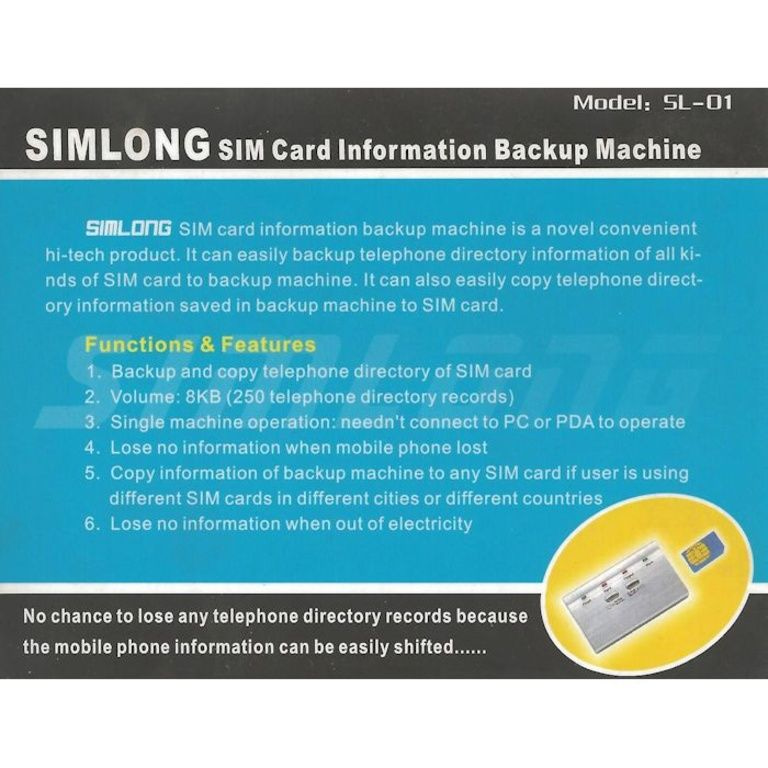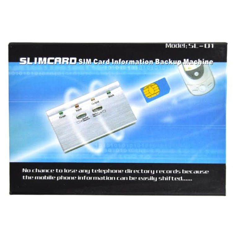De Slimcard Sim kaart informatie back-machine is een handig hi-tech product. Het maakt eenvoudig een back-up van uw Telefoongids (Namen en telefoonnummers) op uw mobiele telefoon. Deze telefoongids informatie van uw mobiele telefoon wordt dan opgeslagen op de Slimcard.