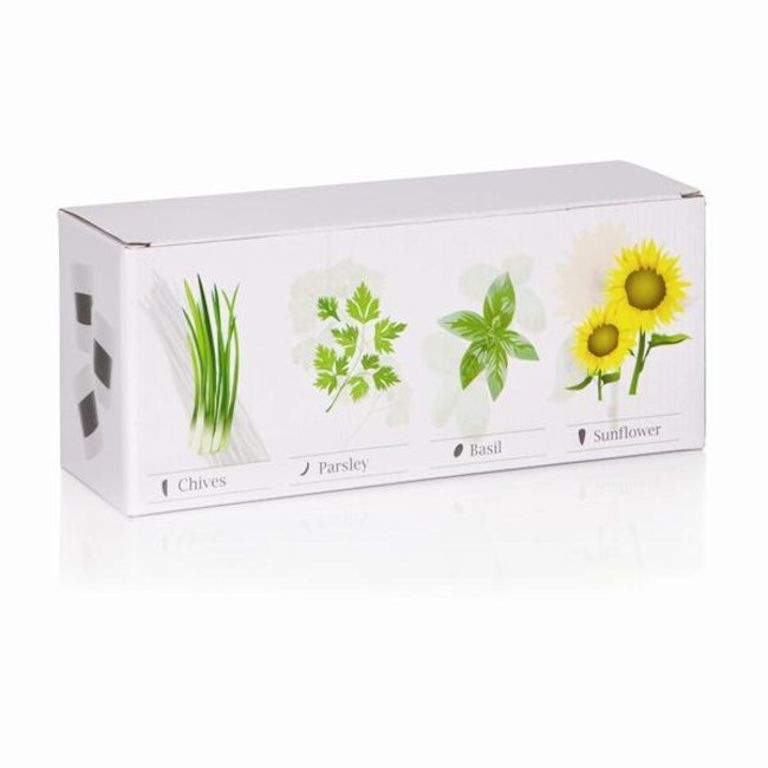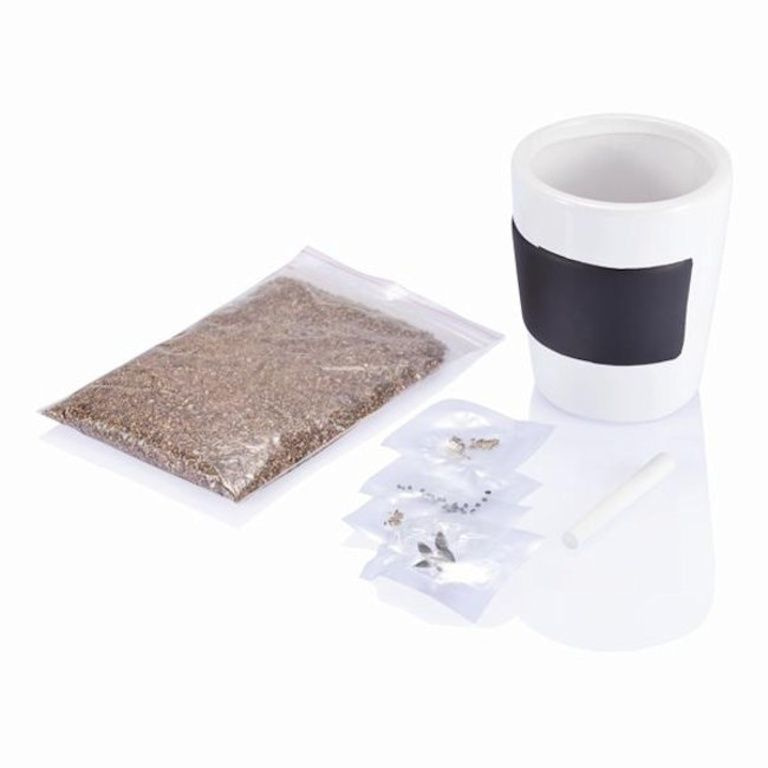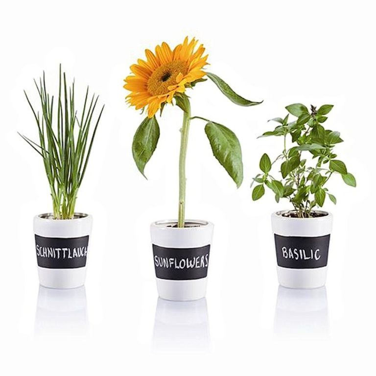 Set met 3 keramische kruidenpotten met krijtbord vlak. Inclusief krijt, potgrond en zaden voor peterselie, bieslook, basilicum en zaden voor zonnebloemen.