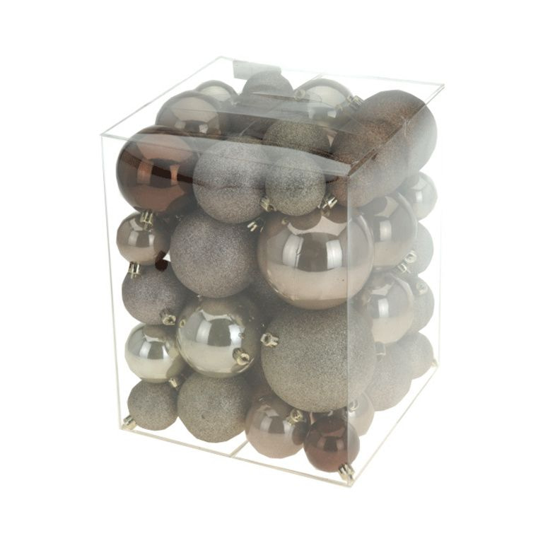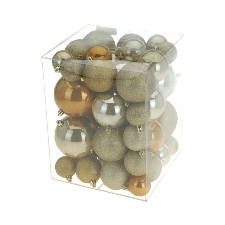 Versier dit jaar je boom met goude en bruine ballen. De kleuren van dit jaar. Met dit pakket haal je in een keer verschillende soorten en maten kerstballen in huis.