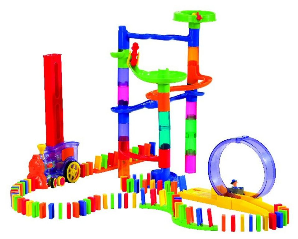 en 1 Dominotrein die de stenen automatisch neerzet.