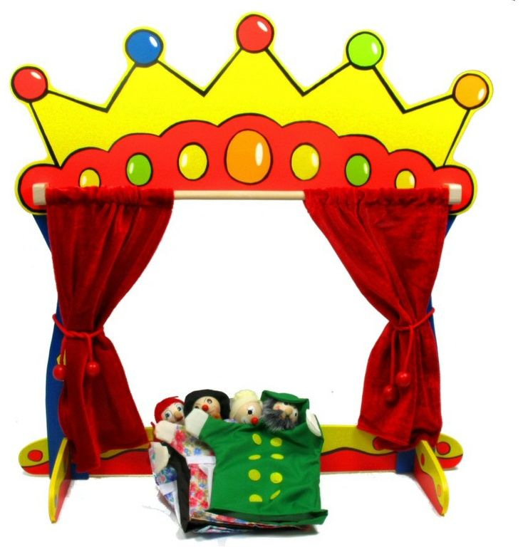 Poppenkast met gordijnen en 4 verschillende poppen.