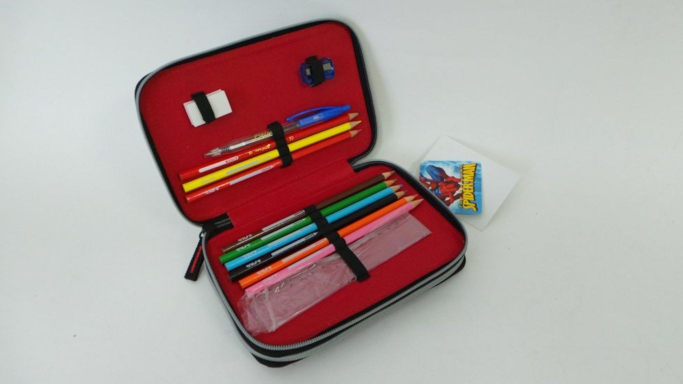 Inhoud o.a. Viltstiften, potloden, gum, liniaal, pountenslijper etc.