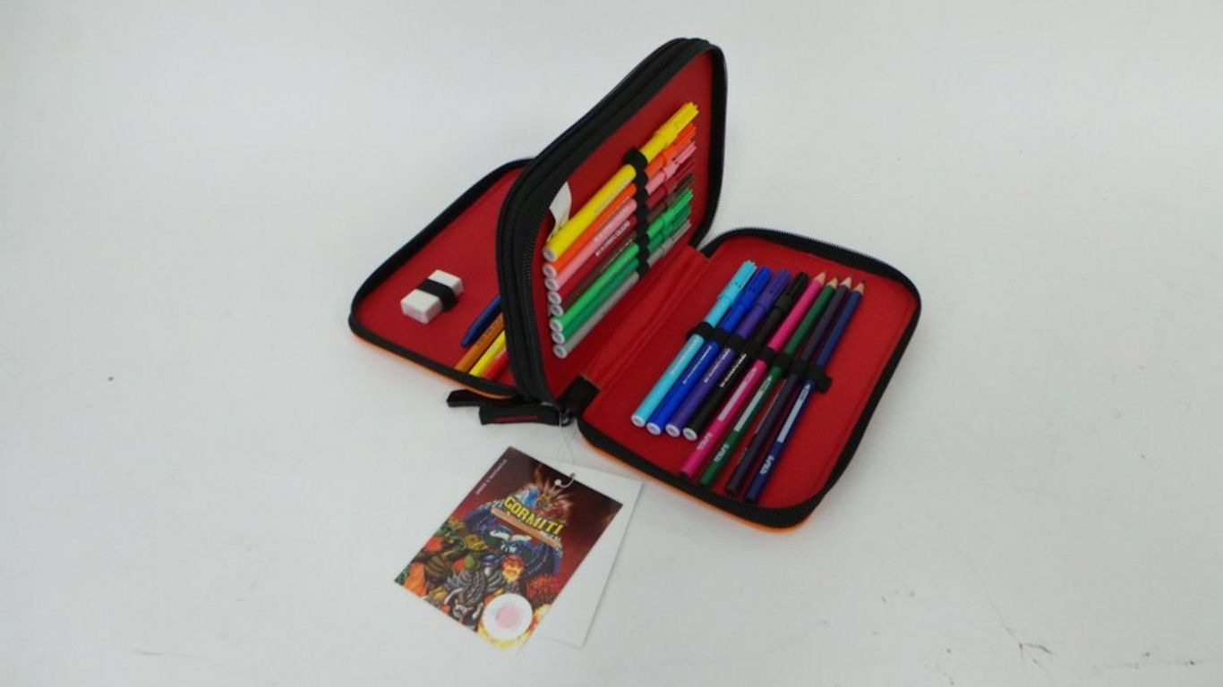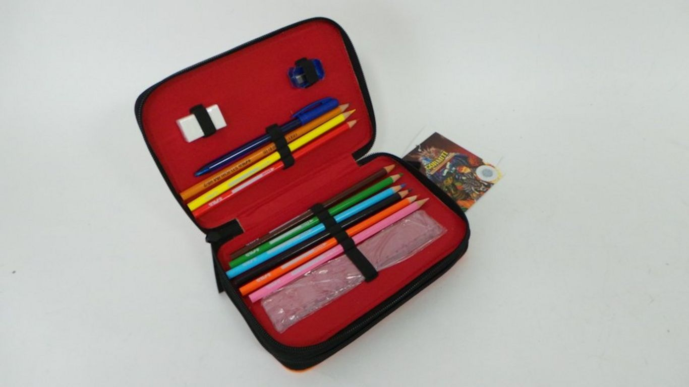 Inhoud o.a. Viltstiften, potloden, gum, liniaal, pountenslijper etc.