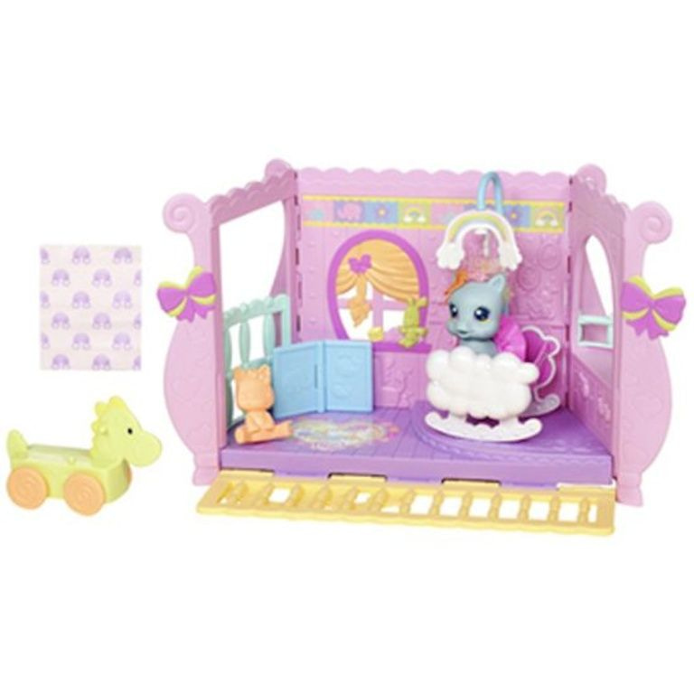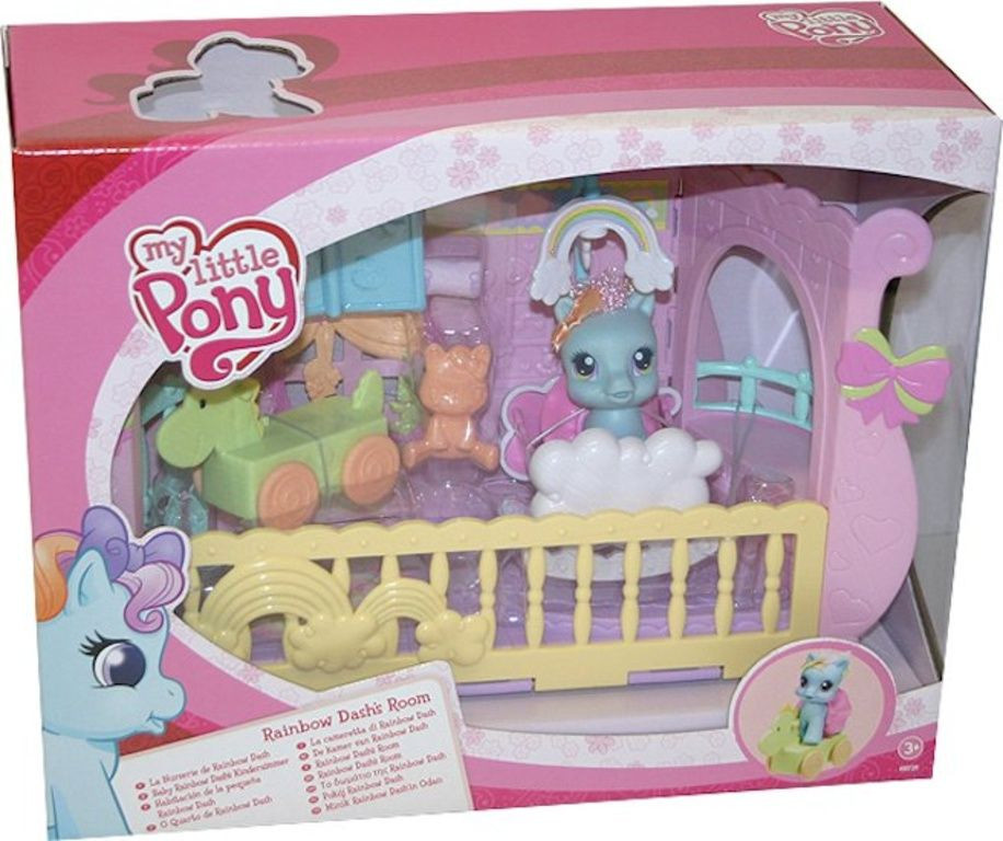 Zorg voor de kleine Rainbow Dash Baby pony. Ze speelt graag in haar kamertje en daarna gaat ze lekker slapen in haar wiegje. Vanaf 3 jaar.
