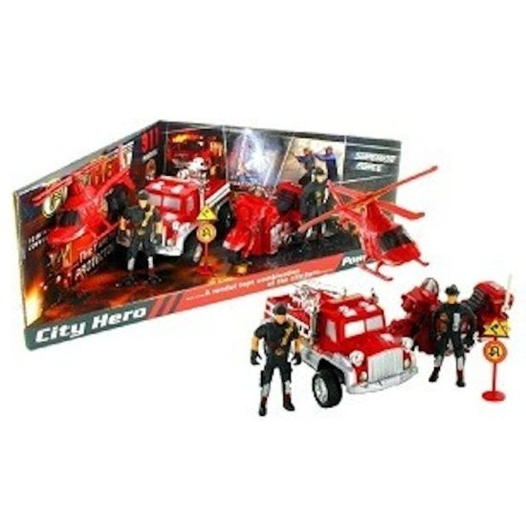 Stoere brandweer speel set bestaande uit: Brandweerauto, motor, helicopter, brandweerman en vele accesoires.