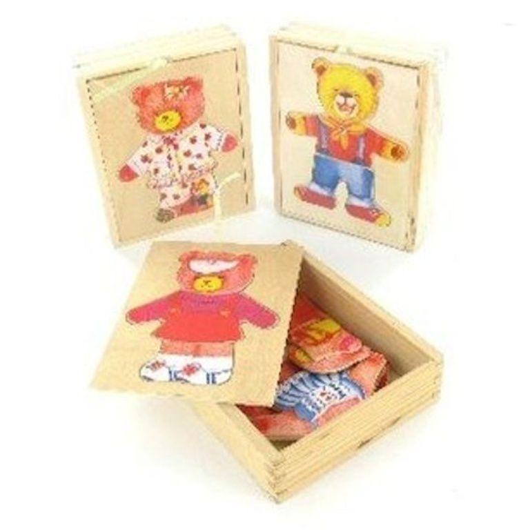 Houten doosje (12 x 14 Cm.) met 6 puzzelstukjes van hout, zodat het gezicht en de kleding van de beer gewisseld kan worden.