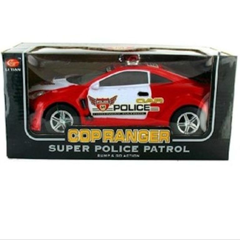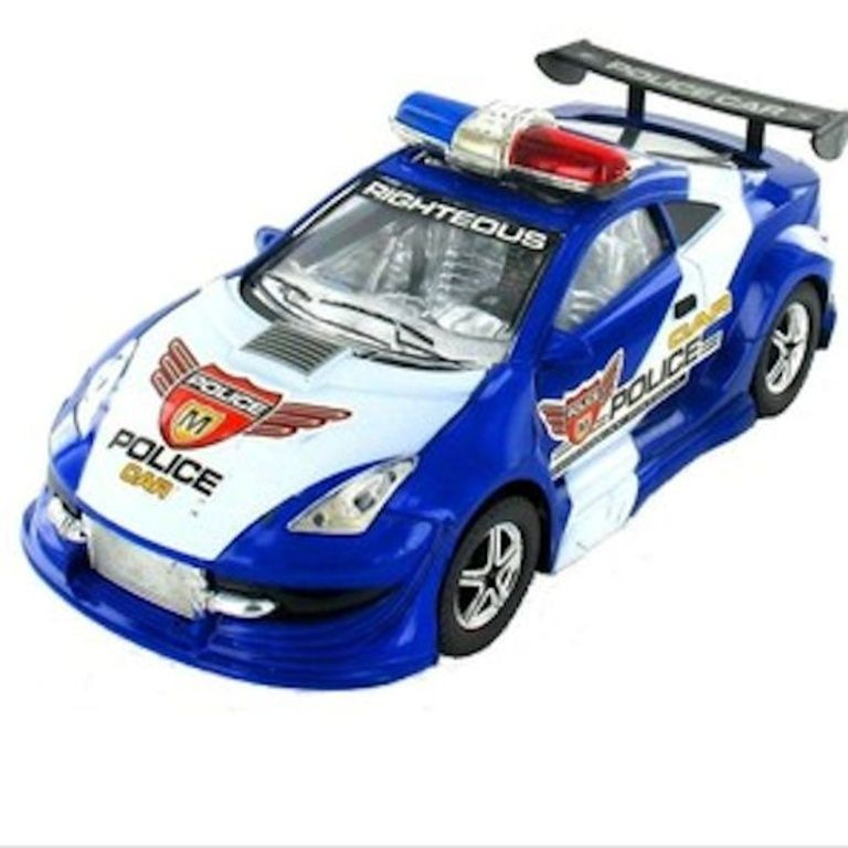 Deze politie auto rijdt vanzelf rond, zodra hij ergens tegenaan bots rijdt hij de andere kant op. voorzien van licht en geluid.