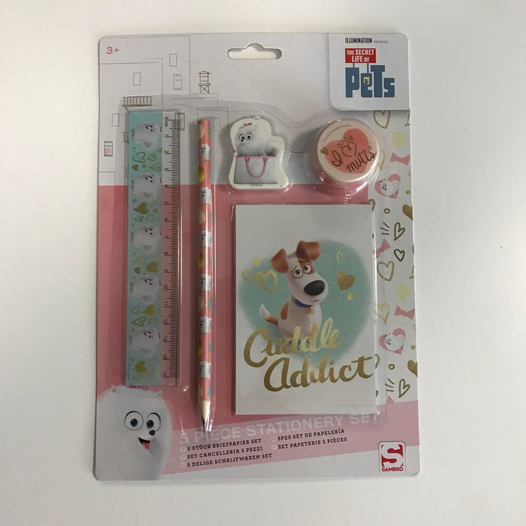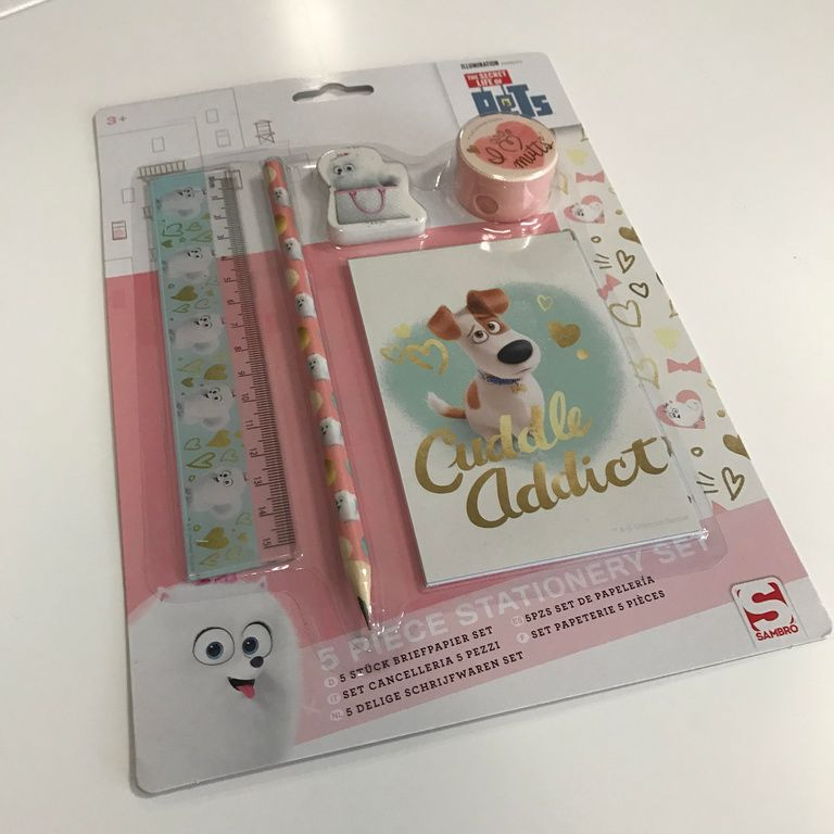 Liniaal, potlood, gum, puntenslijper en notitieboekje.